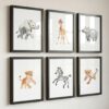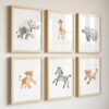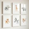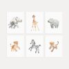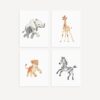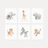 Dieses Produkt ist ein Set aus Kunstdrucken mit Aquarellmotiven von Safari-Tieren. Die Illustrationen zeigen verschiedene Tierarten, darunter einen Löwen und eine Giraffe, in einer kindgerechten und detailreichen Darstellung. Die Motive sind für die dekorative Gestaltung von Innenräumen geeignet.