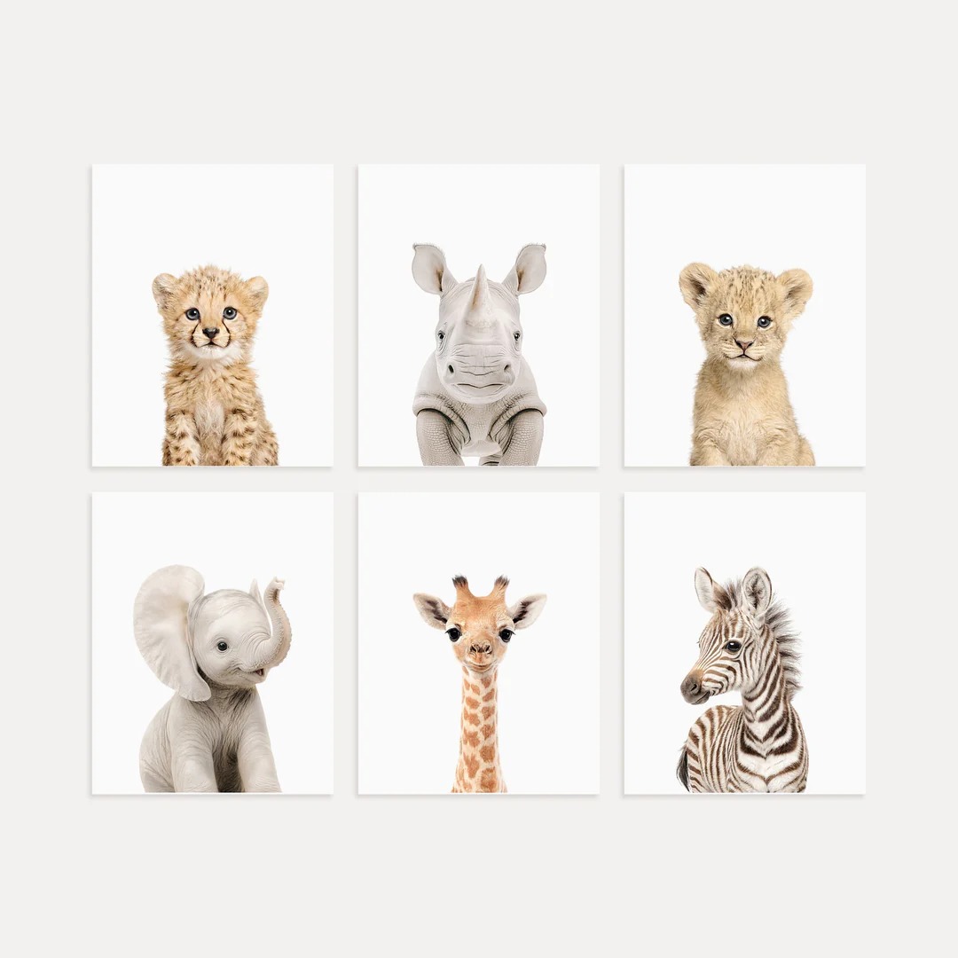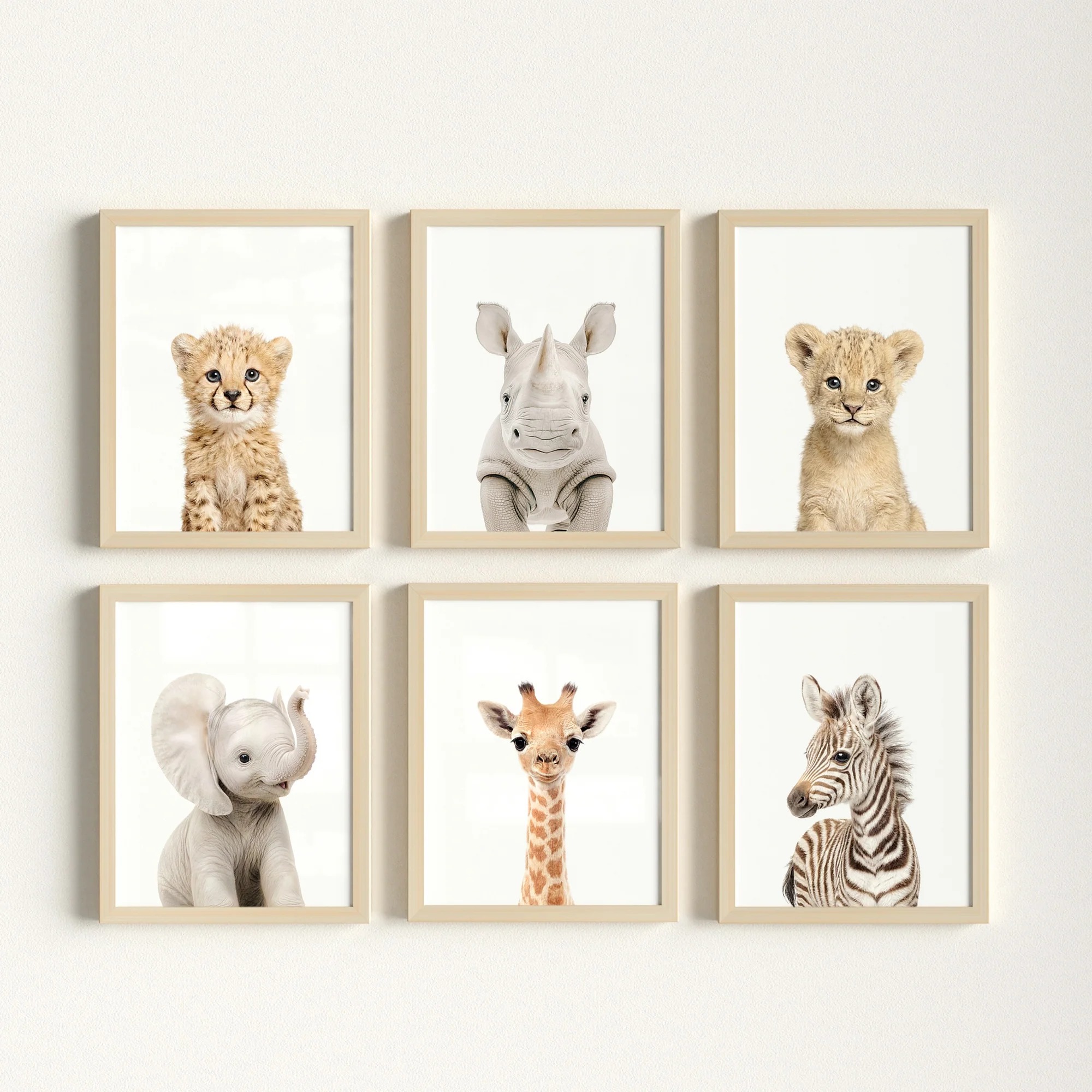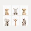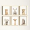 Dieses Produkt ist ein Set aus ungerahmten Kunstdrucken mit Safari-Tiermotiven für das Kinderzimmer. Die Motive zeigen verschiedene Tiere der afrikanischen Savanne und sind für eine thematische Raumgestaltung geeignet.