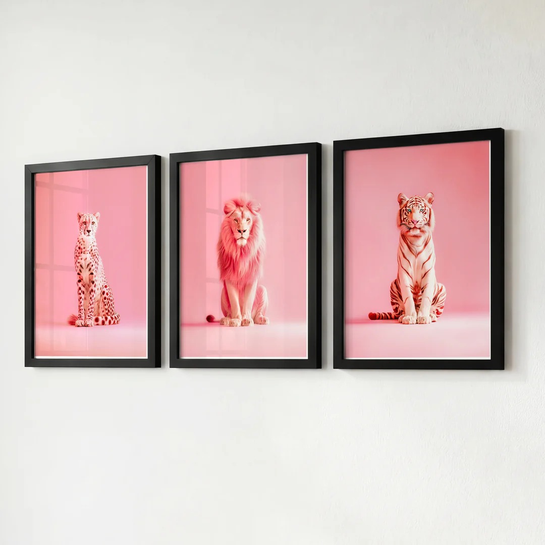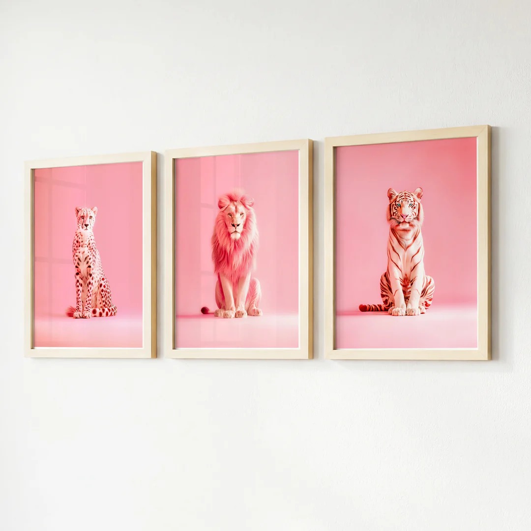 Dieses Produkt ist ein Set aus drei Kunstdrucken mit Tierporträts. Die Motive zeigen einen Löwen, einen Tiger und einen Geparden in stilisierter Darstellung. Die Drucke sind für die Wanddekoration in Wohnräumen, Schlafzimmern oder Arbeitsbereichen geeignet.